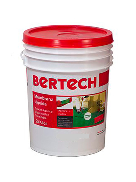 El Caucho acrílico Bertech está formulada con polímeros acrílicos y pigmentos especiales que le confieren impermeabilidad, elasticidad, adherencia, resistencia al tránsito normal y a los agentes climáticos. Es fácil de aplicar, lavable y en colores (blanco, rojo y verde).